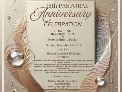 Join us as we celebrate our pastors’ 16th Pastoral Anniversary! We invite everyone to come and share in this special day of honor, fellowship, and gratitude. We hope to see you there.